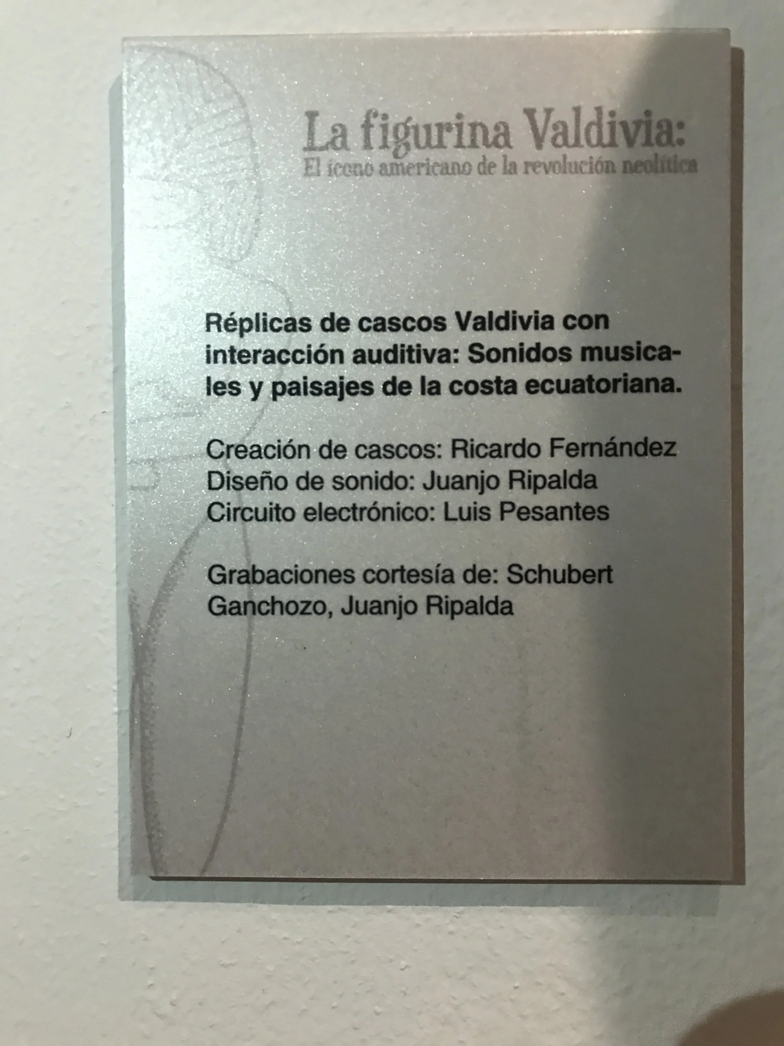 Para la exposición “La figurina Valdivia: el ícono americano de la revolución neolítica” del Museo Antropológico y de Arte Contemporáneo (MAAC), se realizó el diseño sonoro y la producción visual de dos instalaciones multimedia. La primera fue unas réplicas de cascos Valdivia con interacción auditiva de sonidos musicales y paisajes de la costa ecuatoriana.